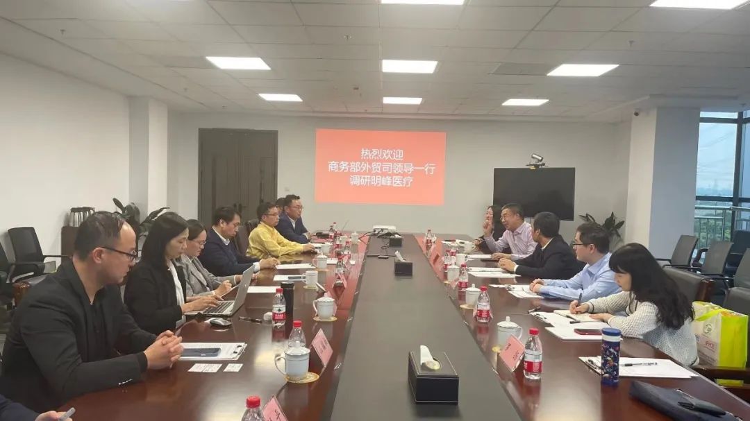 4月11日,商務(wù)部對外貿(mào)易司、中國醫(yī)藥保健品進(jìn)出口商會、浙江省商務(wù)廳和錢塘區(qū)管理委員會等一眾領(lǐng)導(dǎo)前往明峰醫(yī)療位于錢塘區(qū)醫(yī)藥港的新總部大樓進(jìn)行調(diào)研。